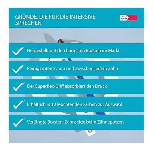 Die Edel+White Flosserbrush Intensive Soft im 2er-Set ist die ideale Wahl für alle, die ihre Zahnpflege auf das nächste Level bringen möchten. Entwickelt in der Schweiz, vereint sie ultraweiche Konex HD® Borsten mit einem flexiblen Griff , um Zähne und Zahnfleisch besonders sanft und dennoch gründlich zu reinigen. Perfekt für Paare, Familien oder als Vorrat für unterwegs.