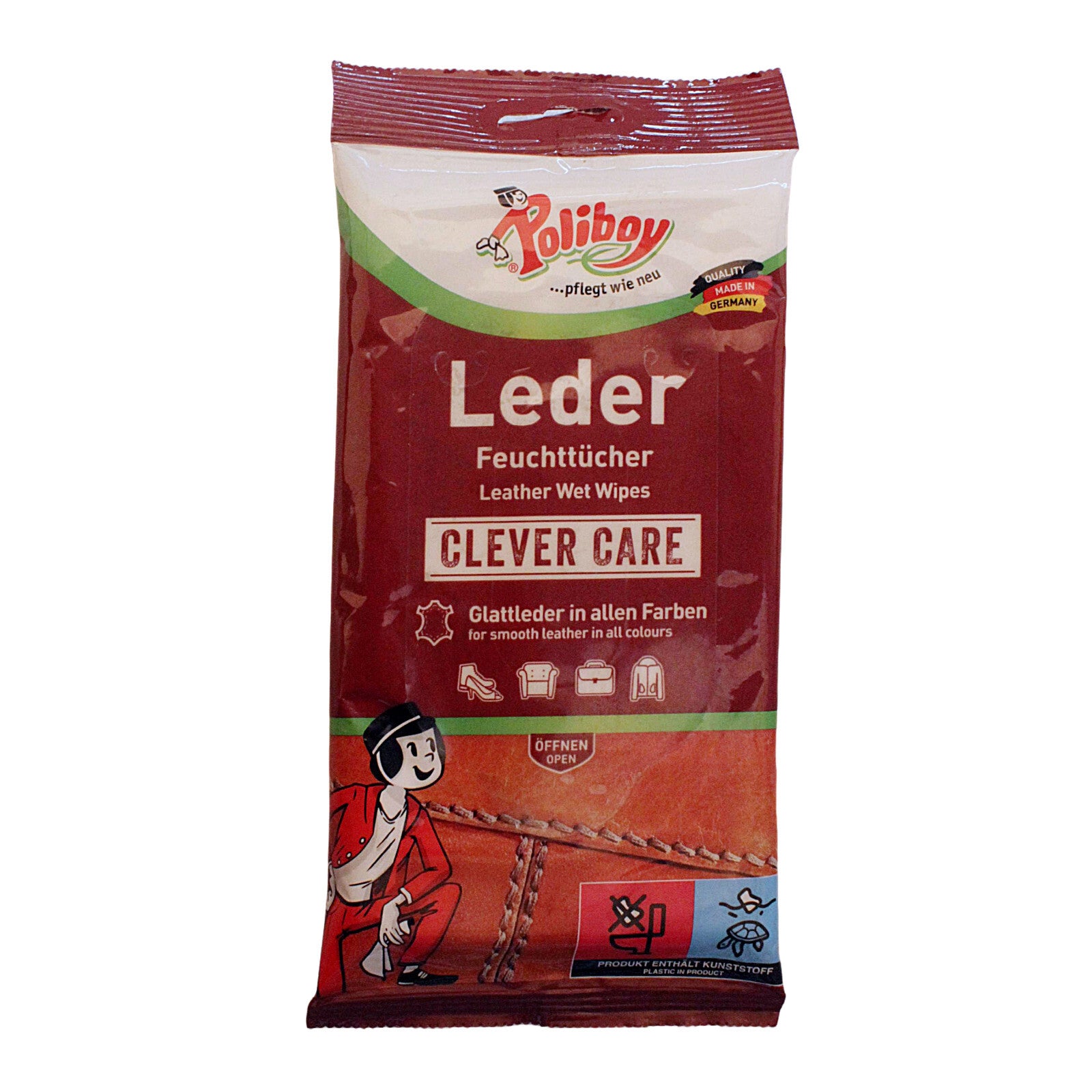Die Poliboy Lederpflege-Feuchttücher im 3er-Pack (je 20 Stück) sind die schnelle und effektive Lösung zur Reinigung und Pflege von glattem und genarbtem Leder. Sie pflegen, schützen und imprägnieren das Leder in einem Schritt - ganz ohne Polieren.