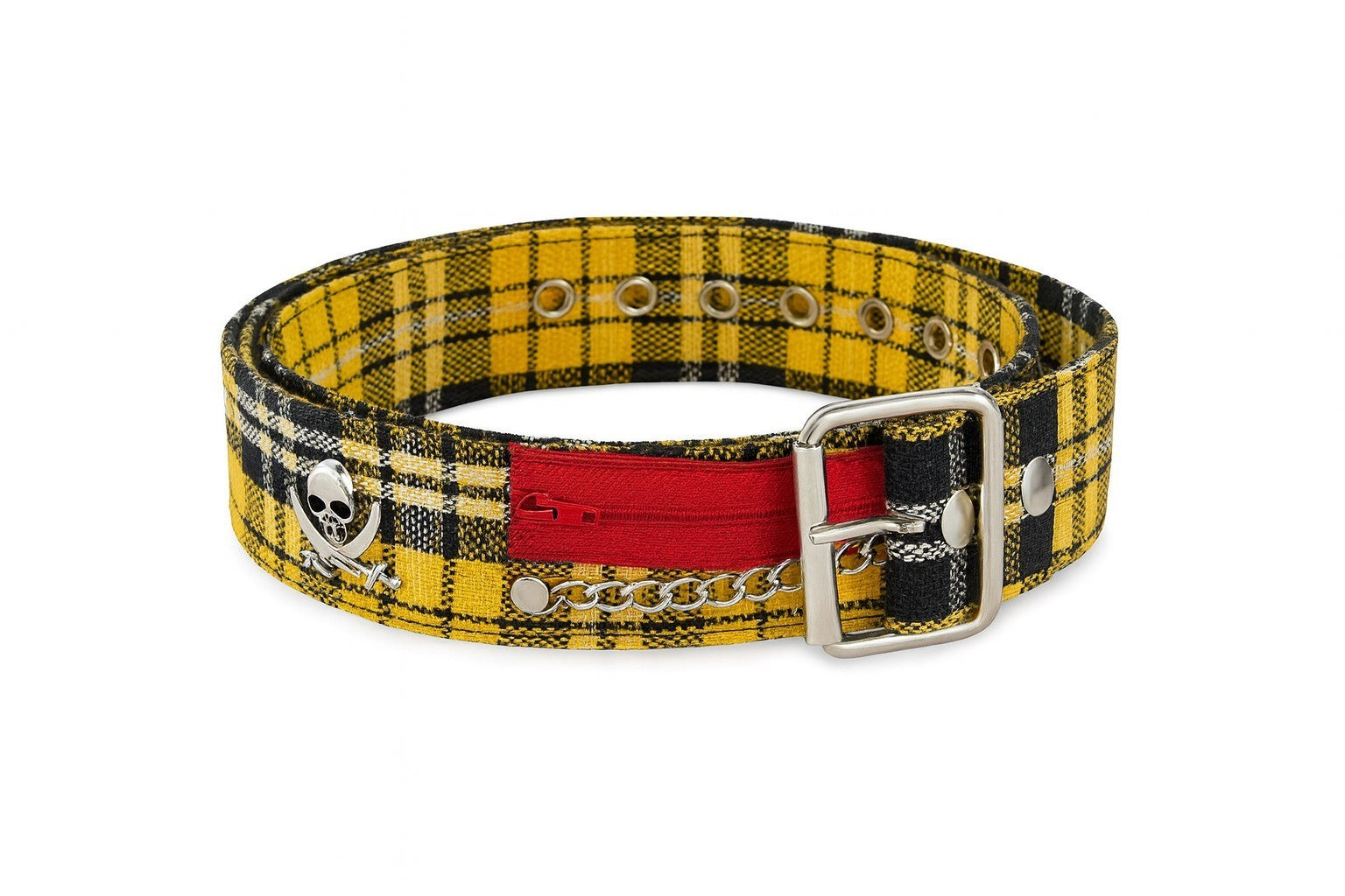 Sie erhalten 44 Stück markante Gürtel im gelb-schwarzen Karo-Look mit coolen Totenkopf-Details, roten Reißverschluss-Elementen und Ketten-Applikationen - ein Must-Have für Rock, Punk, Gothic & Festival-Looks .