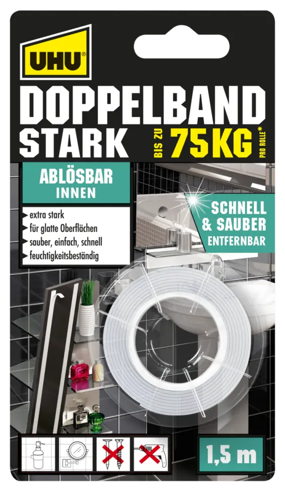 - 1 Rolle UHU Doppelband Stark (ablösbar) bis 75 kg: Ideal für temporäre Anwendungen! Dieses ablösbare Klebeband ermöglicht es Ihnen, Objekte sicher zu befestigen, ohne Rückstände zu hinterlassen – perfekt für wechselnde Dekorationen oder Mietwohnungen.