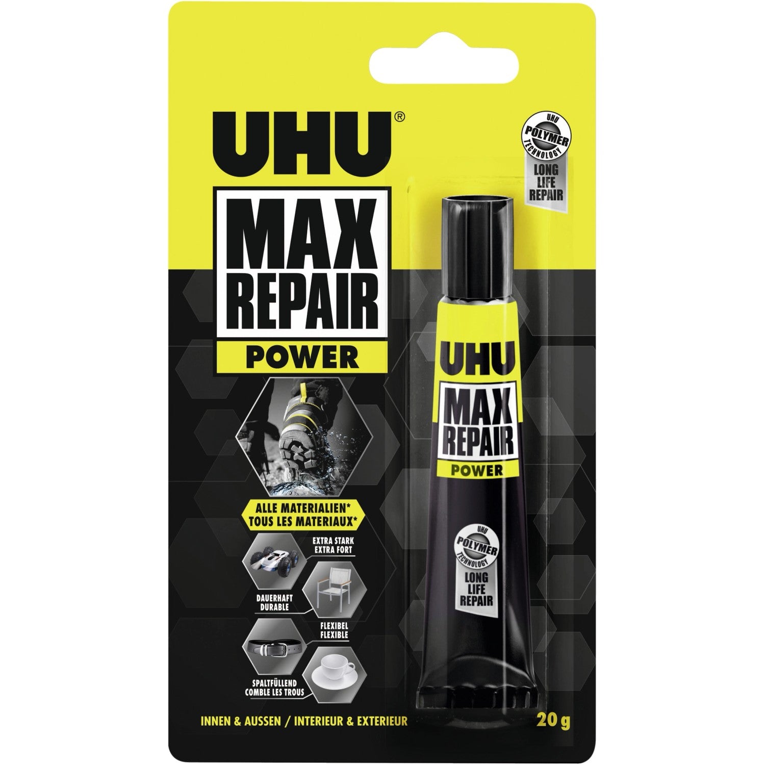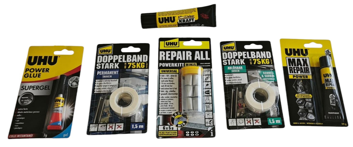 - 1 Tube UHU Max Repair Power: Für besonders anspruchsvolle Reparaturen! Dieser Hochleistungs-Kleber sorgt für extrem starke Verbindungen und ist ideal für schwerere Materialien.