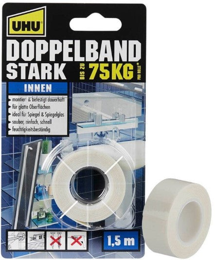 - 1 Rolle UHU Doppelband Stark (ablösbar) bis 75 kg: Ideal für temporäre Anwendungen! Dieses ablösbare Klebeband ermöglicht es Ihnen, Objekte sicher zu befestigen, ohne Rückstände zu hinterlassen – perfekt für wechselnde Dekorationen oder Mietwohnungen.